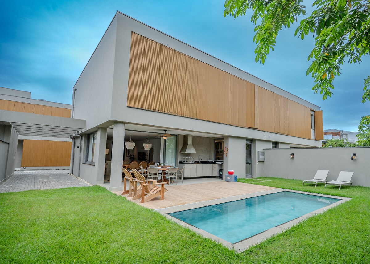 Zeer dicht bij het strand (30 meter) Kom met je gezin naar deze comfortabele plek om te ontspannen en te luisteren naar het geluid van de zee *HET IS NIET AAN DE RIVIÈRA* 📍 Huis gelegen in Praia da Enseada, in de wijk Jardim das Canções, naast SESC. ✨Rustige straat met weinig beweging 🏠Nieuw en modern gebouw 🛋️Gezellige inrichting 🍽️Goed uitgeruste keuken en barbecueplek 💧 Zwembad met ozon en zonneverwarming ☀️ In de winter, met zonneschijn, bereikt het een maximum van 26°C. Diepte: 1.40 m 🚐 We accepteren geen BUSJES.