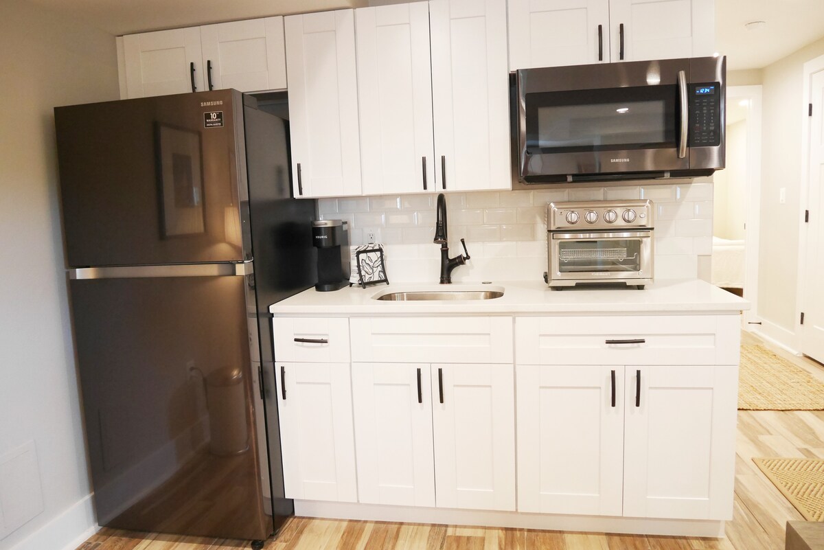 Wij verwelkomen u in een ruim en privé souterrain appartement met eigen opgang en zelf inchecken. Maak het gezellig met je gasten in een ruimte met een slaapkamer met een kingsize bed, een 85-inch smart-tv, zacht sectioneel , eigen toilet, badkamer en kitchenet, allemaal in dezelfde ruimte. Er worden geen voorzieningen gedeeld. De volledig uitgeruste keuken heeft alles wat je nodig hebt om je maaltijden te koken en te verwarmen. De gastsuite is het hele kelderappartement dat deel uitmaakt van een grotere woning waar de verhuurder woont.