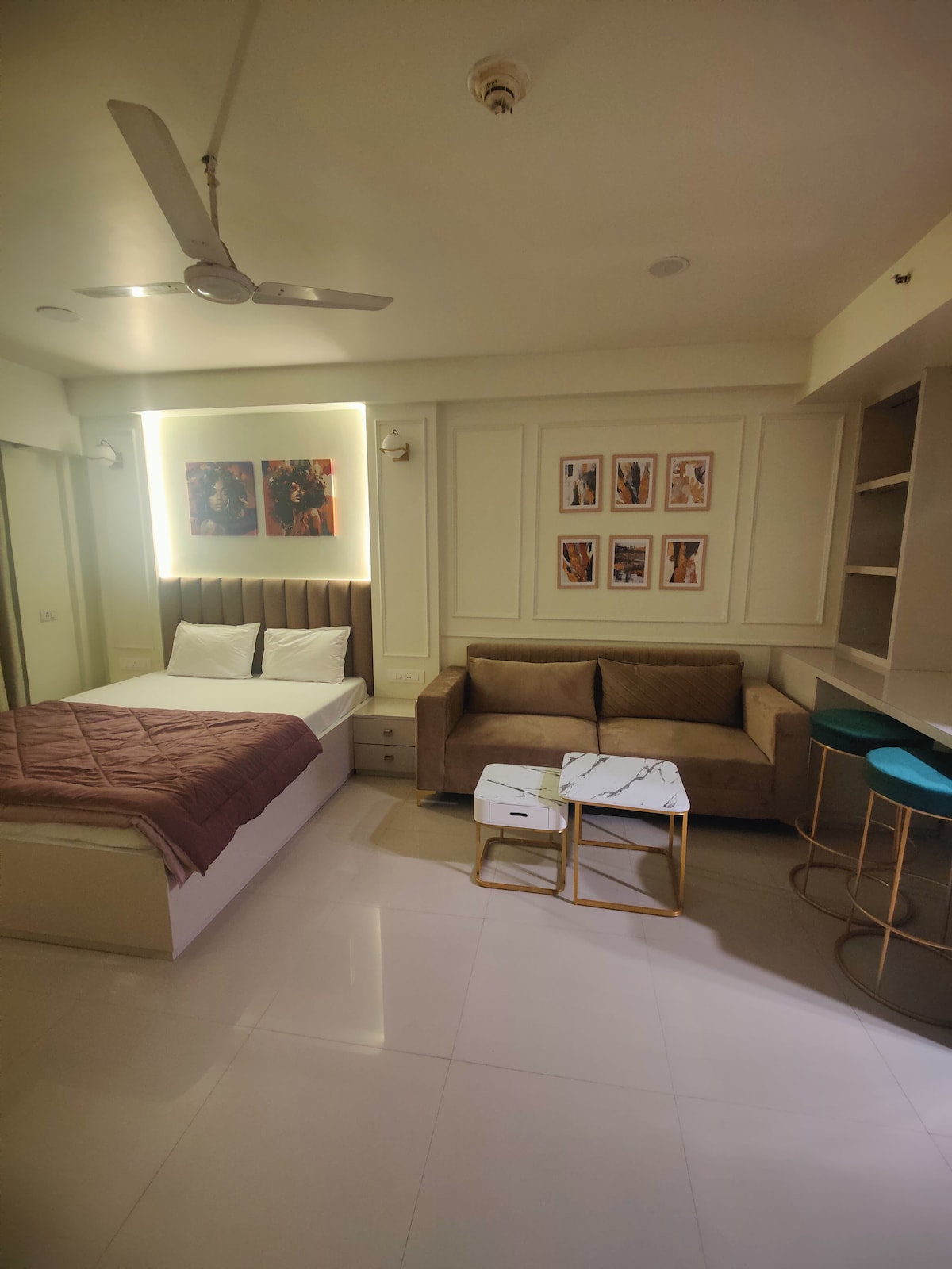 A perfect "stay" where you and your family can experience a peace with a homely environment. It's an air-conditioned single bedroom, with double bed, a study table and a chair, a wardrobe with mirror attached and a locker too, to keep your valuable items safely. Room is attached with a private kitchen, induction cooktop and basic utensils for your usage. A dinning space attached also have a 4-seater dining table, and a refrigerator too.