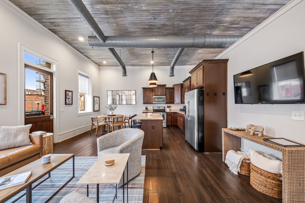 Discover the inviting ambiance of this luminous loft situated in Macon, Georgia. It features a contemporary design, enhanced by high-end elements such as stainless steel appliances and granite countertops. The loft provides two bedrooms, one and a half bathrooms, and is ideally positioned close to the downtown area and Navicent Hospital. Suitable for both families and groups, there's the added benefit of reserving an adjoining loft to accommodate a larger number of guests.