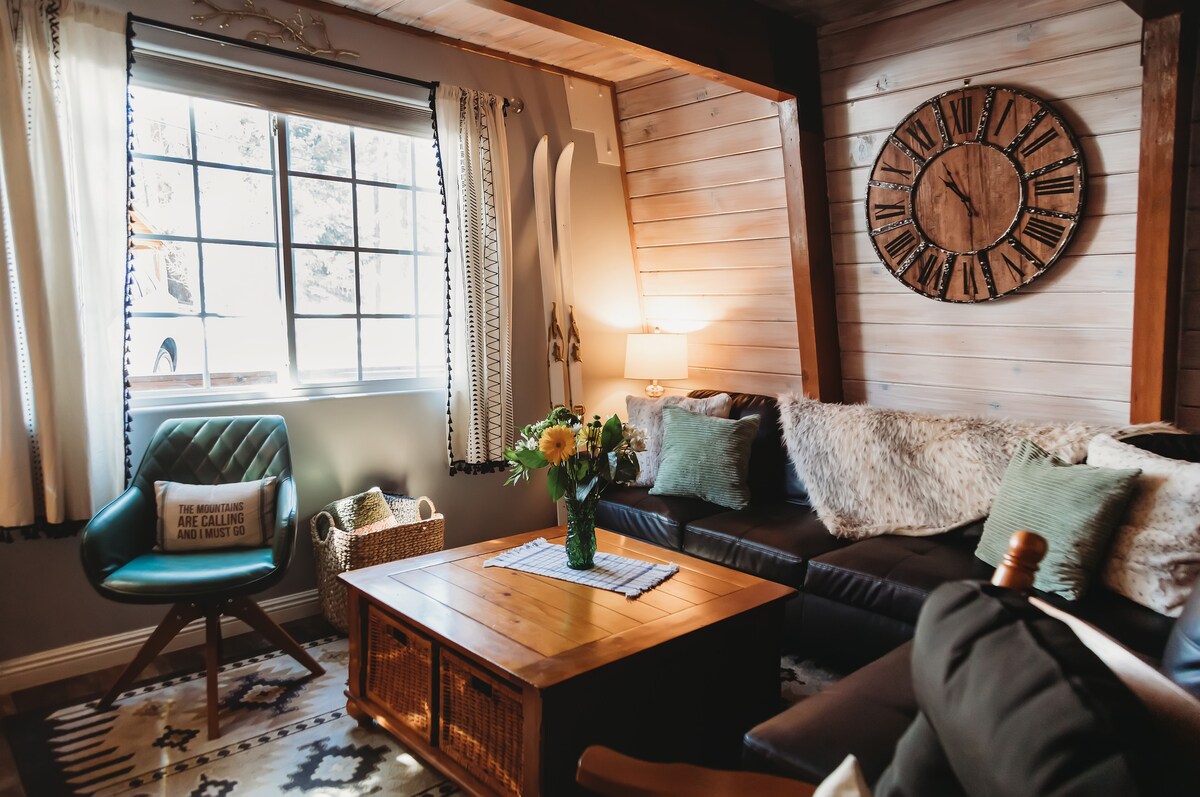 Slechts 5 minuten naar Golf ⛳+ Zoo. Rustig wandelpad verderop in de straat en achtertuin Geniet van een dromerig toevluchtsoord met een spectaculair uitzicht❄️ op de skipiste in een authentieke blokhut in A-frame-stijl met tong-en-groef. Geniet van cacao op het voordek terwijl je geniet van het uitzicht op de ski (of bespioneer de skiërs met onze verrekijker). Kijk naar de zonsondergang achter de bomen 🌄en luister naar de fluisterende dennen om je heen. Geniet van het privé-bubbelbad op de veranda onder de sterrenhemel. Ontspan in de massagestoel na een lange wandeling!