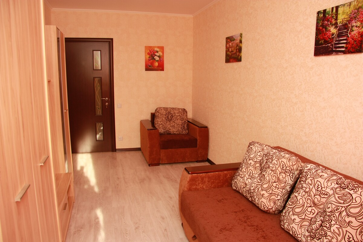 Gezellig appartement met balkon en moderne apparatuur. Wij bieden een stijlvol en comfortabel appartement voor een comfortabel verblijf. Je vindt een ruim balkon met uitzicht waar je kunt genieten van de frisse lucht. Op het erf is er een speeltuin, wat vooral handig is voor gasten met kinderen. De keuken is uitgerust met een koelkast, magnetron, met alles wat je nodig hebt om te koken. Wifi, grote 50 inch tv met smart-tv. Het appartement heeft een douche, bad, toilet. Groot hoogslaper. Supermarkt op 10 minuten afstand.