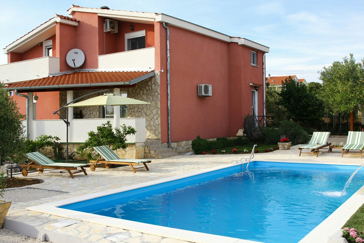 Gehele woning met zwembad, gelegen in Poljica, in de buurt van prachtige steden Zadar en Nin. Drie slaapkamers en twee badkamers. Rustig en rustig, weg van verkeer en stadslawaai. Verscheidenheid aan nabijgelegen stranden (zand, kiezel, verborgen), allemaal binnen 7-20 minuten rijden beschikbaar. Nationale parken met al hun schoonheid liggen op slechts een uurtje afstand. Je kunt ook gewoon uitrusten bij het zwembad.