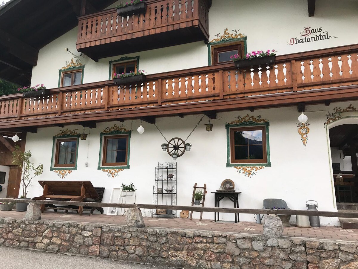 Hoch über dem Tal gelegen über eine Bergstraße erreicht man das historische Haus Oberlandtal. Umrahmt von weiten Bergwiesen auf denen Steinschafe entspannt weiden. Ein traumhafter Blick auf den Watzmann und Hochkalter lassen sie von Beginn an die Zeit vergessen. Die kuschelige Dachgeschosswohnung mit einem Südbalkon wurde liebevoll eingerichtet. Teils antike Möbel und Details die aufwendig restauriert wurden machen dieses Feriendomizil zu etwas ganz Besonderem.Wir freuen uns auf euren Besuch!