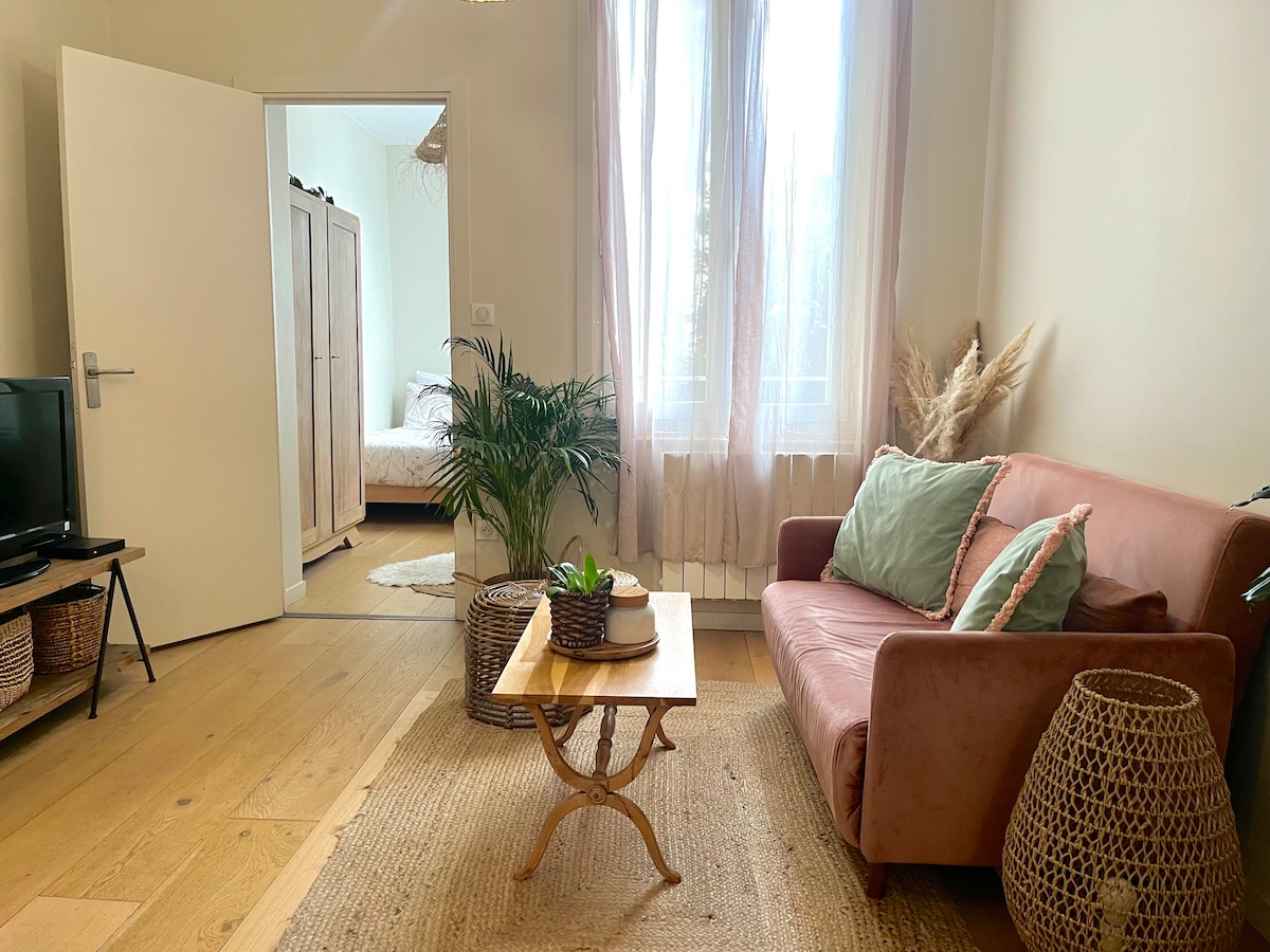 Op de vloer van een huis, en volledig onafhankelijk, bieden deze charmante 2 kamers van 32 m2 je een volledig ingerichte en uitgeruste woonruimte (woonkamer/ keuken), een comfortabele slaapkamer en een badkamer met bad en wasmachine. Je vindt alles wat je nodig hebt om te koken, te rusten, te werken (wifi-toegang), tv te kijken (toegang tot Netflix), te lezen (toegang tot de bibliotheek), enz...