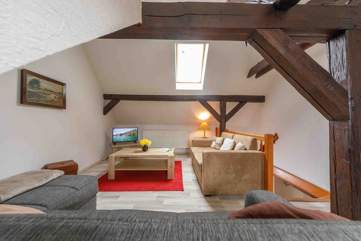 Hauptvermietung März - Nov. im Winter macht es unser kleiner Ofen schön warm, eine Heizung gibt es natürlich auch. Unter der Dachschräge befindet sich eine Küchenecke, die für einfache Gerichte, Kaffee/Tee ausgestattet ist. Im Bad Dusche und WC, im SZ ein Holz-Bett 140x200 cm mit neuer höherer Matratze +Topper und 1 Schrank. Im WZ steht eine Eckcouch, die Platz für 1 Person zum schlafen bietet, 1 Sessel, TV und ein Essplatz für 3 Personen. W-Lan vorhanden.