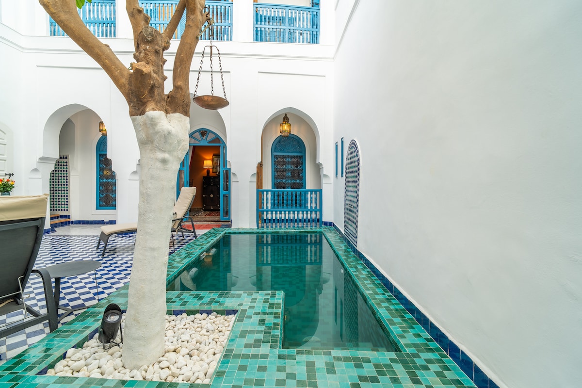 Kom tot rust in onze privé boutique riad in het hart van de oude medina van Marrakech. De centrale patio, in aardse kleuren, met zwembad (verwarmd) is de perfecte plek om te ontspannen na het winkelen in de souks of het verkennen van de nabijgelegen oude monumenten. Het zonnige dakterras is perfect om te zonnebaden of om de warme Marrakech-avonden door te brengen. Alle kamers zijn met zorg ingericht, zodat u zich tijdens uw verblijf in Marrakech in absolute luxe waant.
