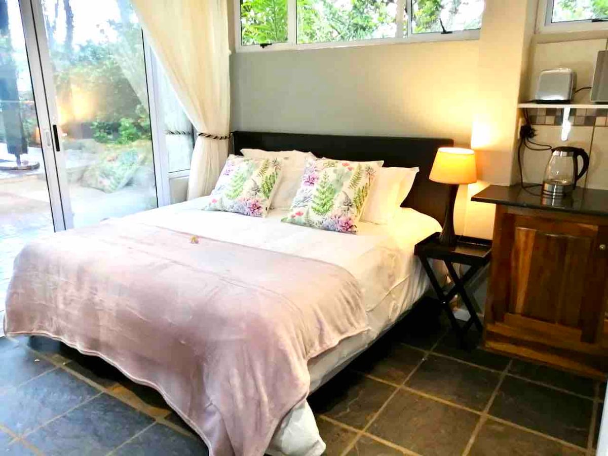 Maak wat herinneringen op deze unieke en speciale plek. We kunnen 2 volwassenen of 2 volwassenen en 2 kinderen ontvangen. Kinderen zijn meer dan welkom. We hebben een kingsize bed voor 2 volwassenen, een slaapbank voor 1 extra volwassene of 2 kinderen, en op aanvraag een campingbedje. Braai beschikbaar. Veilig parkeren onder weelderige bomen. Self catering, met gasfornuis, koelkast en magnetron. Gratis wifi en smart-tv met Netflix, Bureau om te werken of te leren. Ontspannende plek voor iedereen! Dicht bij winkelcentrum, sportschool, restaurants en scholen.