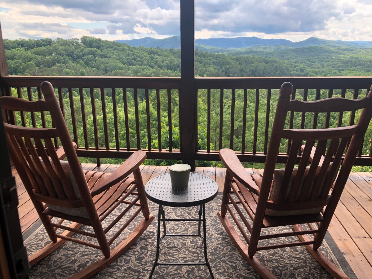 Your Blue Ridge Mountain View Escape awaits! Enjoy breathtaking, layered 50-mile mountain views from this immaculate log cabin. Designed for relaxation and romance, with multiple outdoor decks, private hot tub, cozy indoor and outdoor fireplaces, fire pit, and pool table. Perfect for special occasions or couples featuring two King suites separated for privacy. Updated and stocked with essentials, it blends rustic charm with modern comfort; located exactly between Blue Ridge and Ellijay.