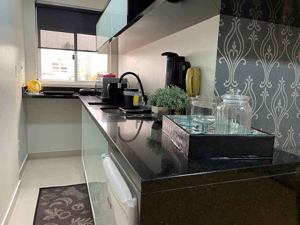 Mooi studio-appartement, in het centrum van Blumenau, vlakbij alles! Het gebouw heeft een fitnessruimte en een ongelooflijk zwembad op het dak. Het appartement is compleet en zeer stijlvol. Tweepersoonsbed, lakens, hoezen, kussens, badhanddoeken, airco. Volledige keuken met koelkast, magnetron en servies voor 2 personen. Wasserij met strijkijzer en strijkijzer.