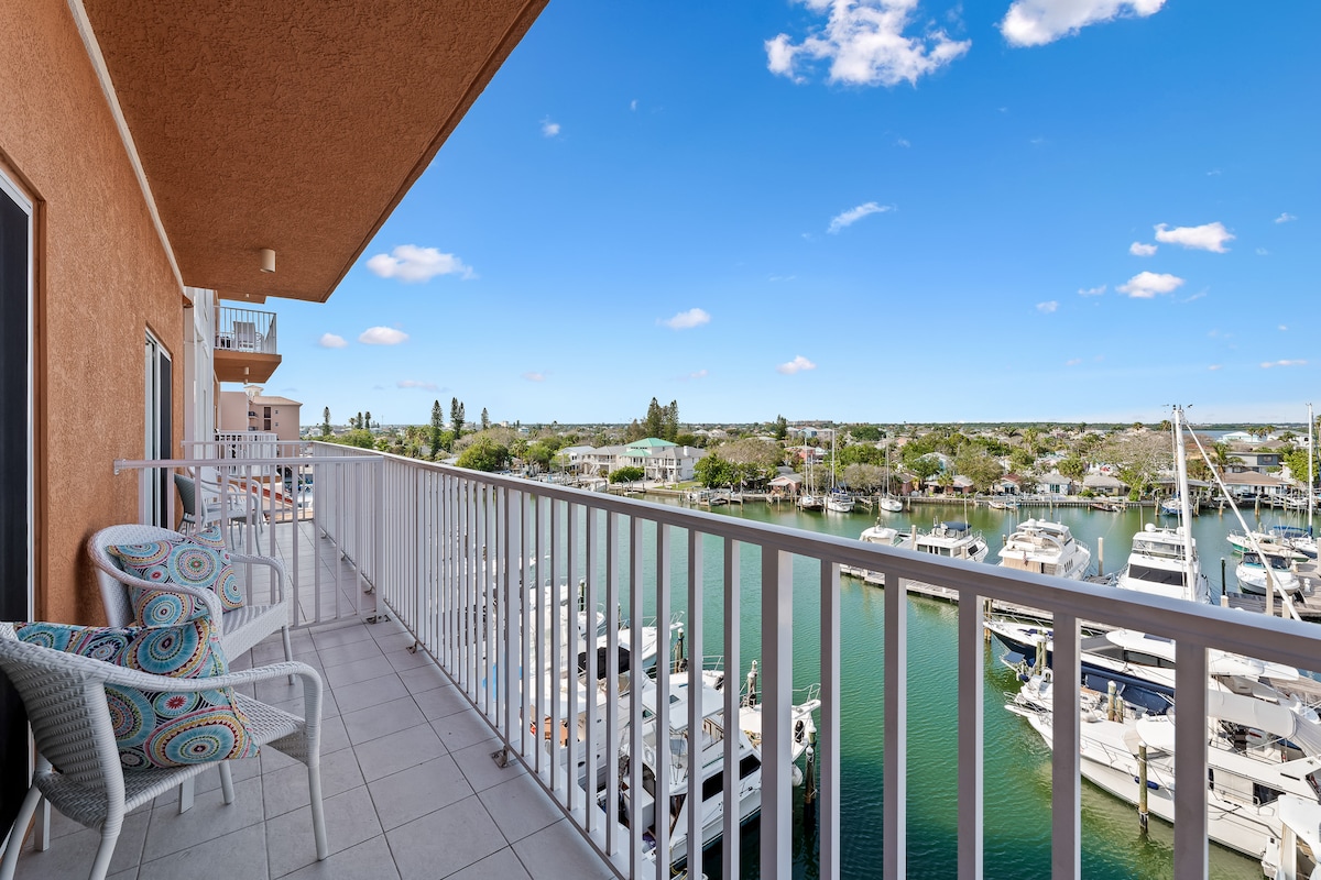 Deze unit is volledig vernieuwd en modern! Geniet van een PRACHTIG uitzicht vanaf het 20' privébalkon met uitzicht op de baai, het zwembad en het bubbelbad! Bekijk elke ochtend dolfijnen terwijl je van je koffie geniet, of terwijl je 's avonds van een glas wijn geniet! Op 6 minuten rijden van Madeira Beach en dicht bij alle voorzieningen met veel restaurants in de buurt, waaronder Doc Ford's naast de deur, en winkels binnen 7 minuten. Veel te doen; dichtbij vissen, waaronder diepzeevissen, en jetskiën. 1 slaapkamer, geschikt voor 4 personen; comfortabele slaapbank.