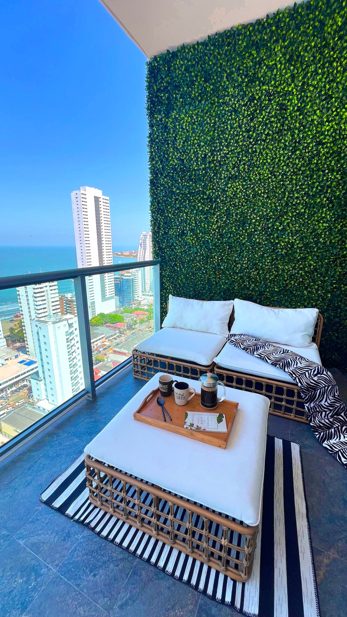 Welcome to a Stylish Corner Apartment with stunning open sea views. Breathtaking sunsets. Come enjoy a home away from home. Pleasant and relaxing vibes. Full Size Kitchen. Just 50 yards distance from the building entrance to the beach. Amazing location with everything at your fingertips in this 24 hour doorman building. Groceries, convenience stores, wine stores, pharmacies, restaurants, and much more. Easy 5-10 minute commute into the old colonial city.