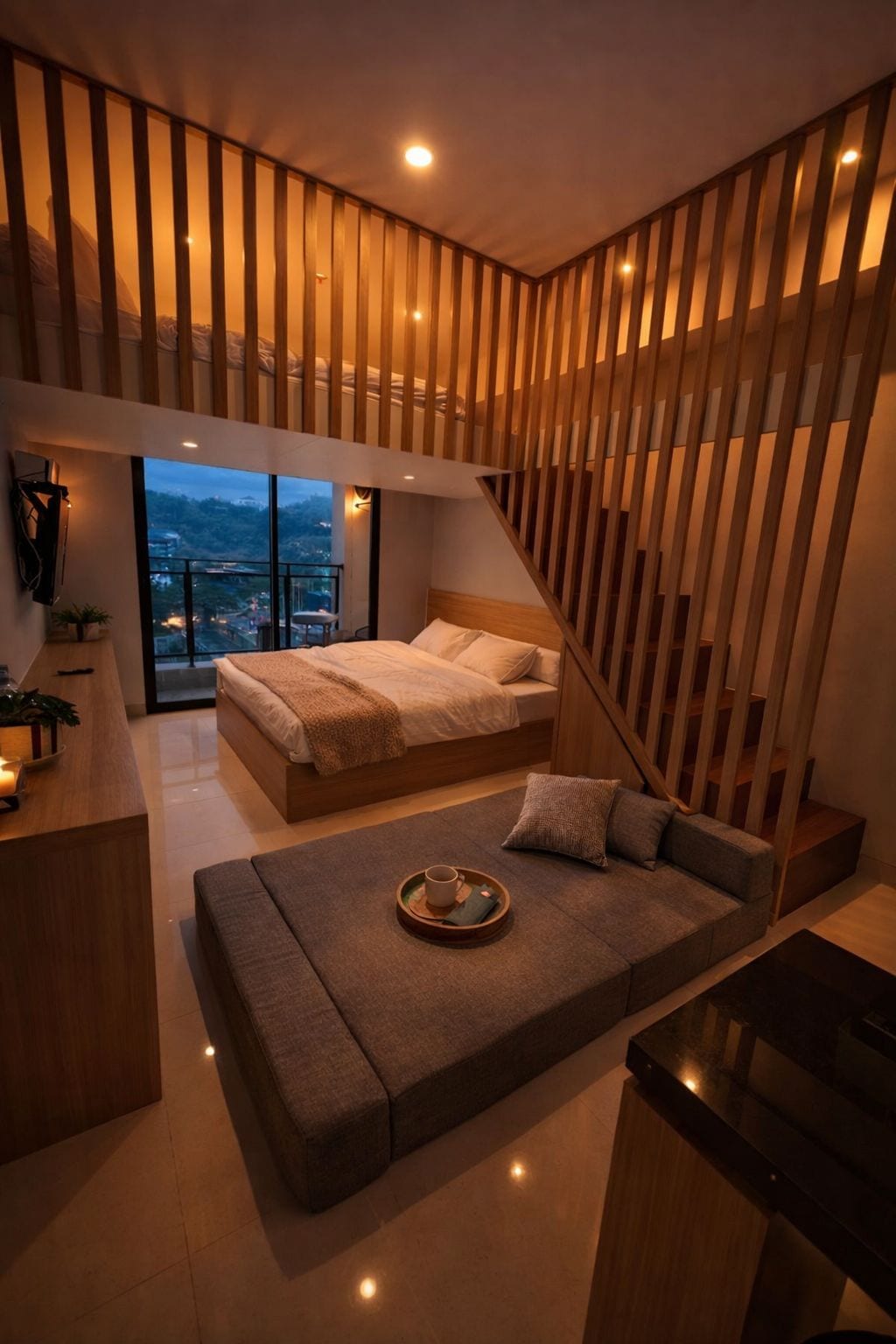 Welkom bij Ikiru Sanctuary, gelegen in LRT City Sentul City (Royal Sentul Park) — een rustig toevluchtsoord waar Japandi-ontwerp een prachtig uitzicht op de bergen ontmoet. Deze serene oase, ontworpen voor twee volwassenen en twee kinderen, integreert het Japanse minimalisme naadloos met Scandinavische warmte, waardoor een sfeer van rustige verfijning ontstaat. Als je binnenkomt, onthullen kamerhoge ramen een adembenemend uitzicht op majestueuze bergen en nodigen je uit om te ontspannen te midden van het stedelijke landschap.