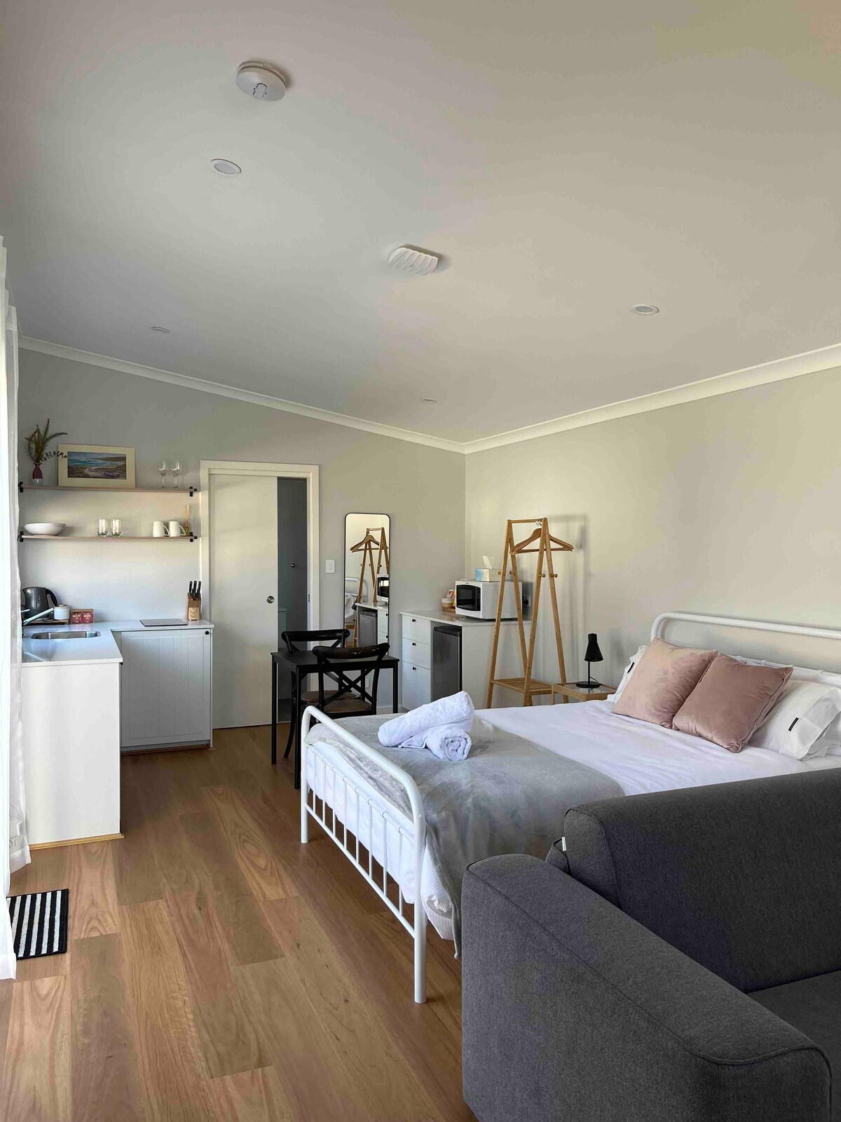 Silver Gypsy Flat adjoins our home. Key entry, secure steel window & door screens, a/c, table, chairs, pantry, induction cooktop, mini-oven, sandwich maker, frypan, kettle, toaster, pod coffee maker, juicer, glass oven, microwave, rice cooker, fridge/freezer, china, cutlery & glasses. Sofa bed, new 50" tv, lamps, queen bed, desk, chaise lounge, walk-in robe & ensuite, pillows, quilts & linen. Private garden, BBQ, patio table, chairs, brolly & free offroad parking. Late arrivals' Key Lock.