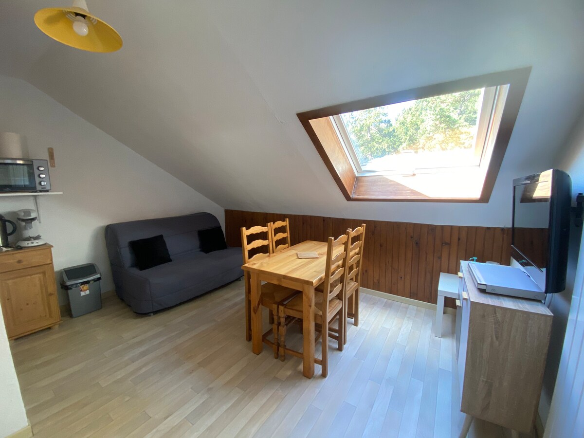 Je hebt een plek nodig om je batterijen op te laden, kijk niet verder dan dit mooie kleine gehuurde appartement met garage op de derde en laatste verdieping van een woning, gelegen in het hart van het resort Les Angles is voor jou! IDEAAL voor koppels met/zonder kinderen, maar wees voorzichtig, het oppervlak blijft klein en schuin voor het bovenste deel, bedankt om naar de foto 's te kijken. Wifi 1 hoofdslaapkamer met kleedkamer. 1 hutbed met boven een bed voor 2 personen + 1 eenpersoonsbed eronder.