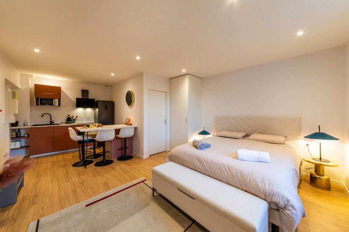 Voor een weekend of voor een lang verblijf, plaats jezelf in deze zeer comfortabele en zorgvuldig ingerichte cocon. Het appartement biedt zeer mooie diensten met moderne en volledig uitgeruste keuken, slaapkamer met tweepersoonsbed met high-end beddengoed en beddengoed, prachtige doucheruimte. Een gedeeltelijk overdekt terras stelt u in staat om buiten te genieten van gezellige momenten. De residentie is veilig, op 2 stappen van het centrum. Gemakkelijk en gratis parkeren, airconditioning, tv, wifi etc...