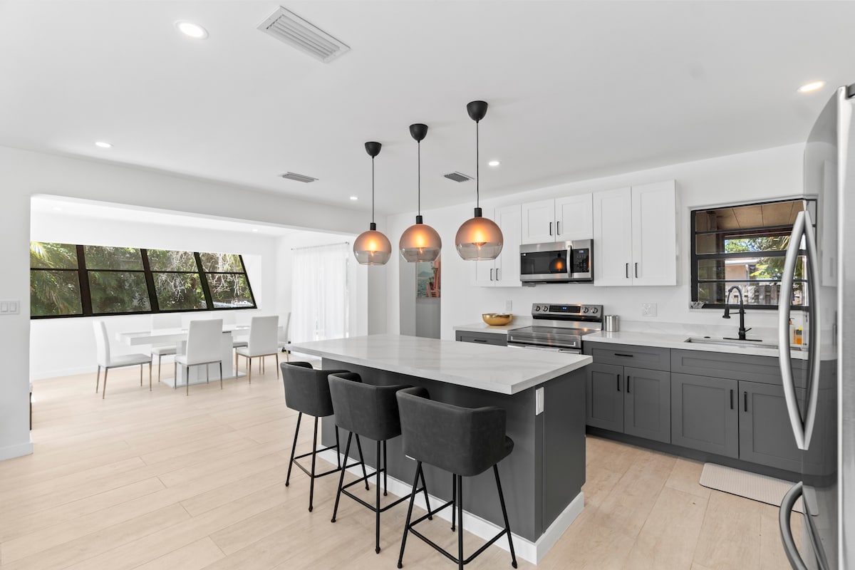 Gedurfd interieur in dit onlangs gerenoveerde pad met een prachtige gracht en aanlegsteiger in delray. Stap voor de voordeur en meteen zie je de grote ramen die uitkijken op het water aan de achterkant. Dit is trouw aan Delray Beach met al zijn charme. Ga nu op een film staan op het grote 75 inch smart-tv-scherm, rust je hoofd op de comfortabele bedden, douchen onder de regenarmaturen en ontspan echt in een Delray-geous uitje. Slechts zes minuten naar het strand of het geweldige nachtleven en restaurants van Delray.