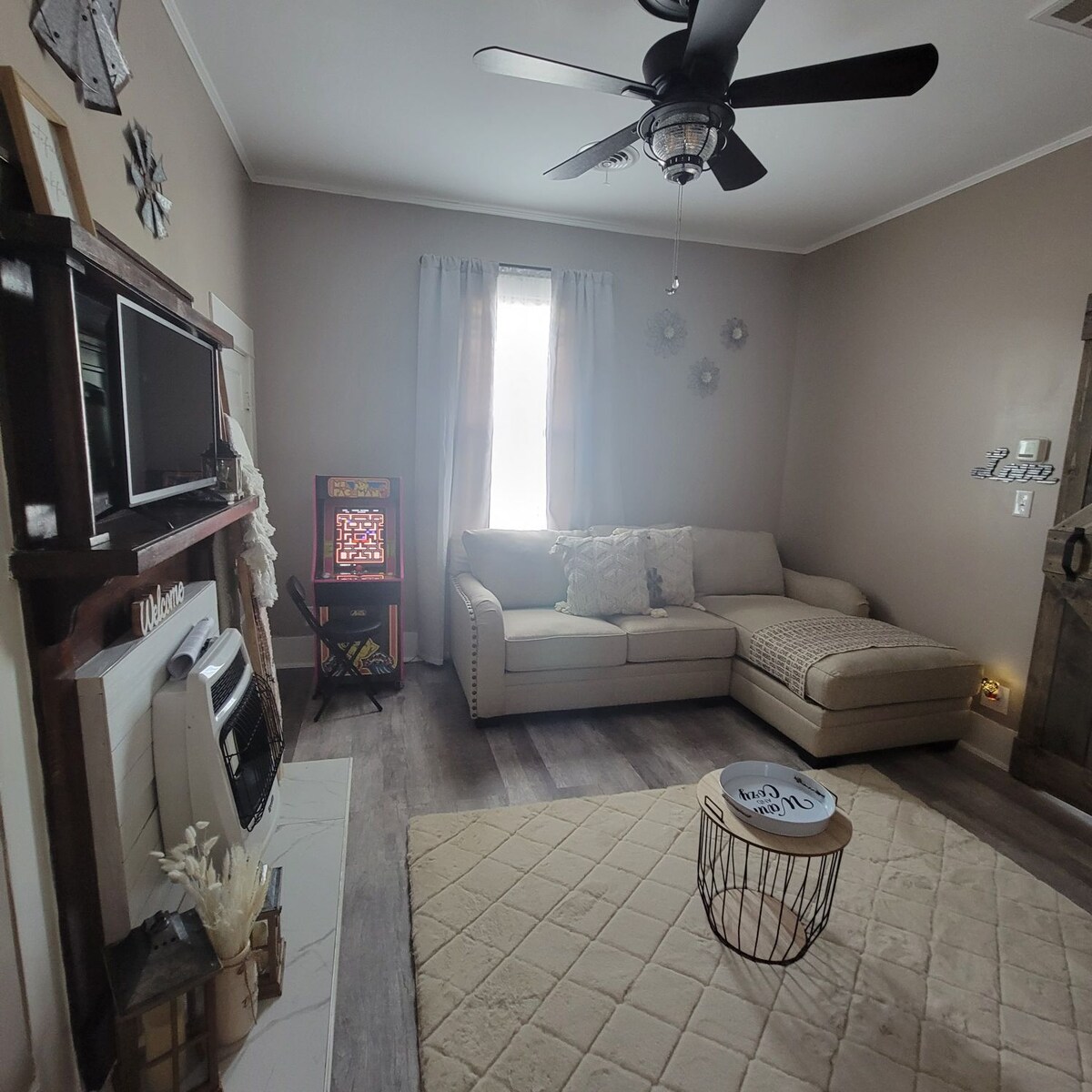 Geniet van een stijlvolle ervaring met een aantal nieuwe en oudere onderhouden functies die Rustic Charme te bieden heeft in deze centraal gelegen plek. Rustieke Charme zal elk verblijf leuk, comfortabel engezellig maken. 1 bd rm met een kingsize bed, een kast en een kluis om je persoonlijke bezittingen op te bergen. De woonkamer biedt een hangstoel binnen (350 pond met limiet) waarin je kunt ontspannen na een lange dag. 2 smart-tv 's met snel internet en streamingdiensten beschikbaar. Het hele jaar door elektrische open haard in de slaapkamer.