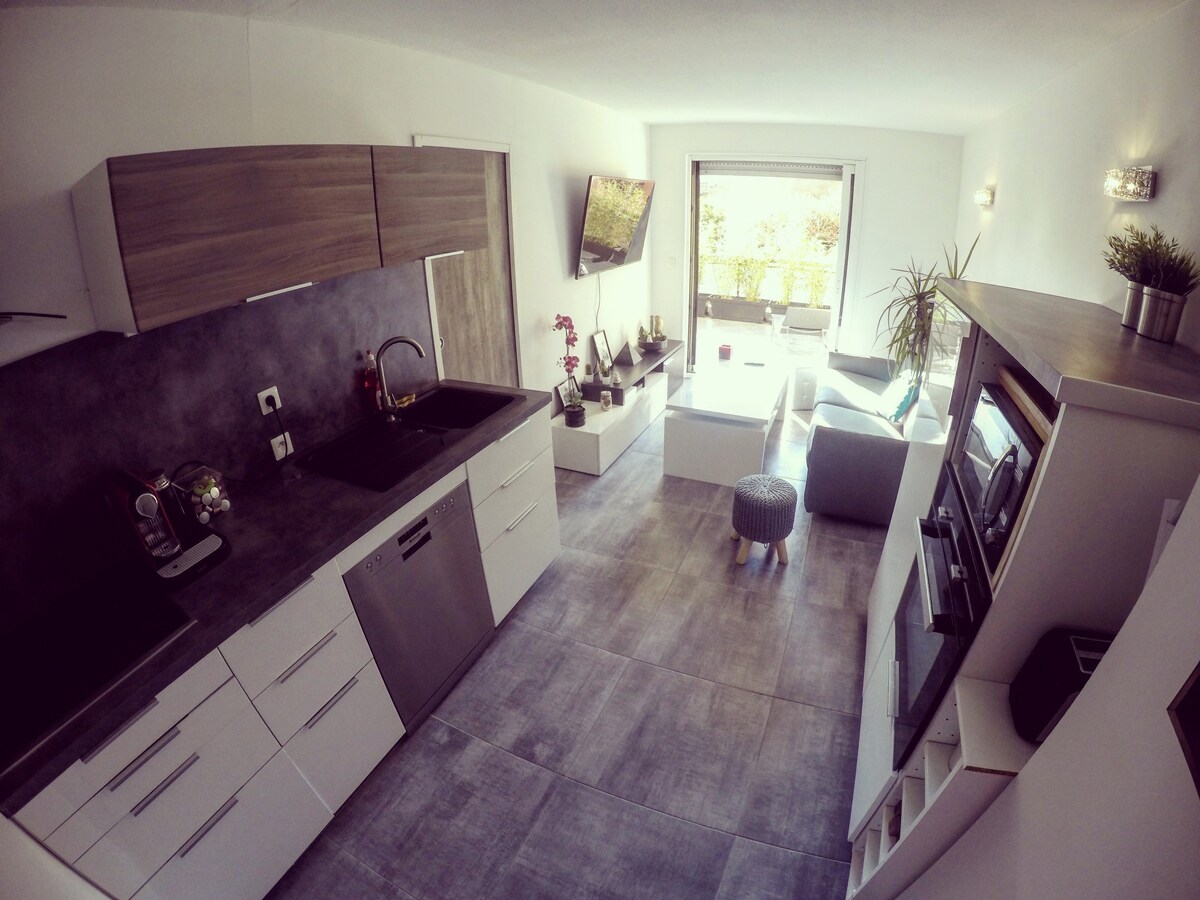 Geweldig appartement van 30m2 met een terras van 16m2, moderne inrichting, zeer schoon, zonnig, airconditioning, gerenoveerd in 2017, in het hart van lavandou. Gelegen in een rustige straat met eigen en beveiligde parkeergelegenheid. Zet je koffers neer en doe alles te voet. Je hebt geen auto nodig. Het strand is 200m evenals restaurants, winkels etc.