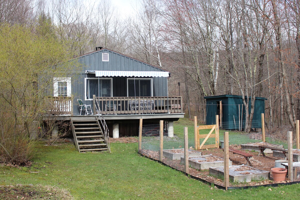 Deze 575 vierkante meter grote hut ligt tussen Margaretville en Andes, NY. Geniet 's avonds van de hangmat, het grillen en de vuurplaats. Geweldig om te lezen, te ontspannen en als uitvalsbasis om het prachtige Delaware County te verkennen. Antiekwinkels, schuurverkopen en boerderijstandaarden zijn de hele zomer geopend.