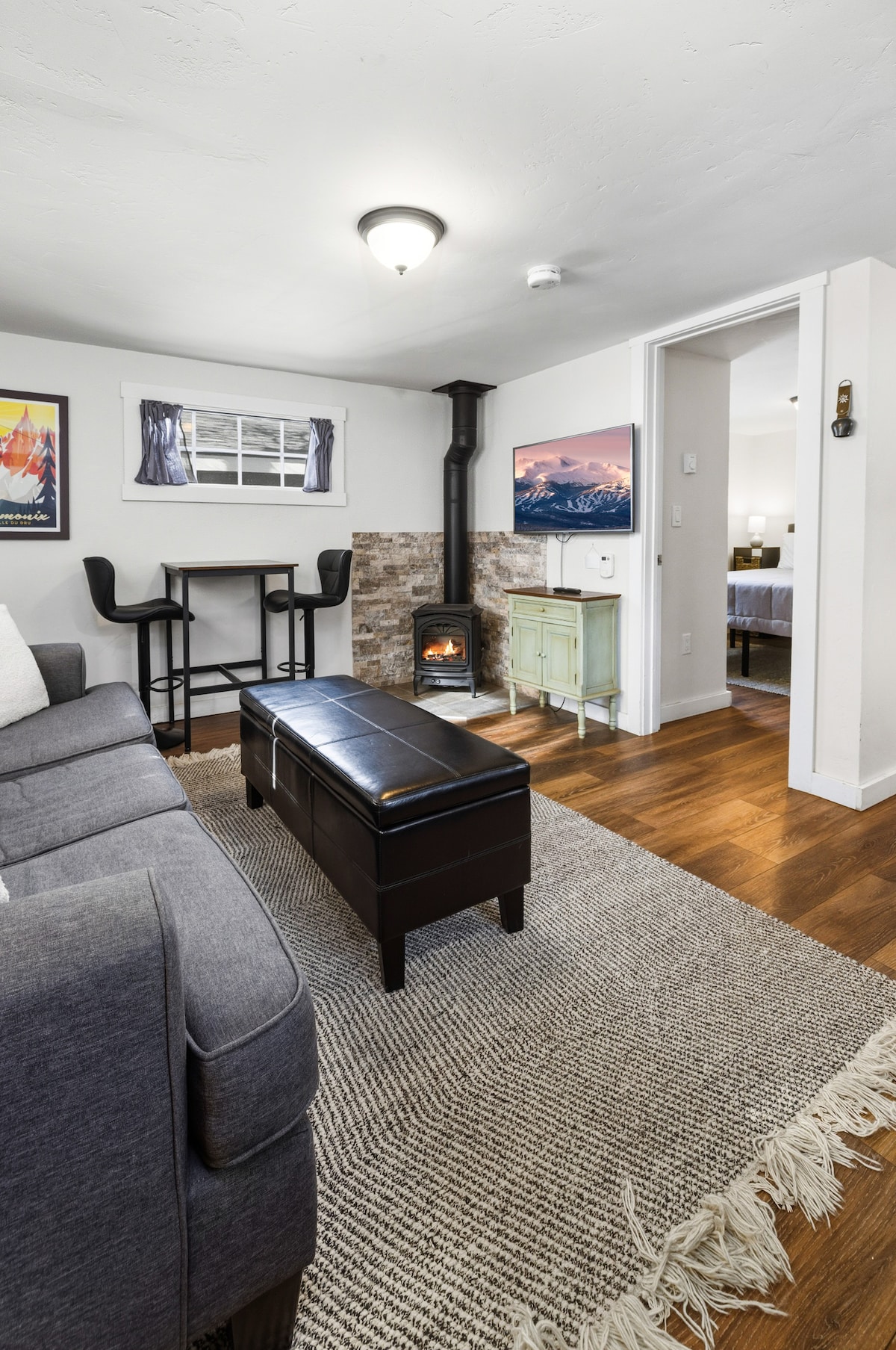Bijgewerkte luxe studio, direct aan Four O 'clock Run! 200 stappen naar SnowFlake skilift, ski-in down 4 O' clock Run, 3 blokken naar historische Main Street, op loopafstand van wandelpaden en mountainbikeplek. Dit volledig bijgewerkte appartement beschikt over een pluche queensize ergomotion bed, een lichte en lichte badkamer met modern meubilair en vloerverwarming, een volledig uitgeruste keuken en een open woonkamer met een eettafel voor twee, een bank, een elektrische open haard en een smart-tv.