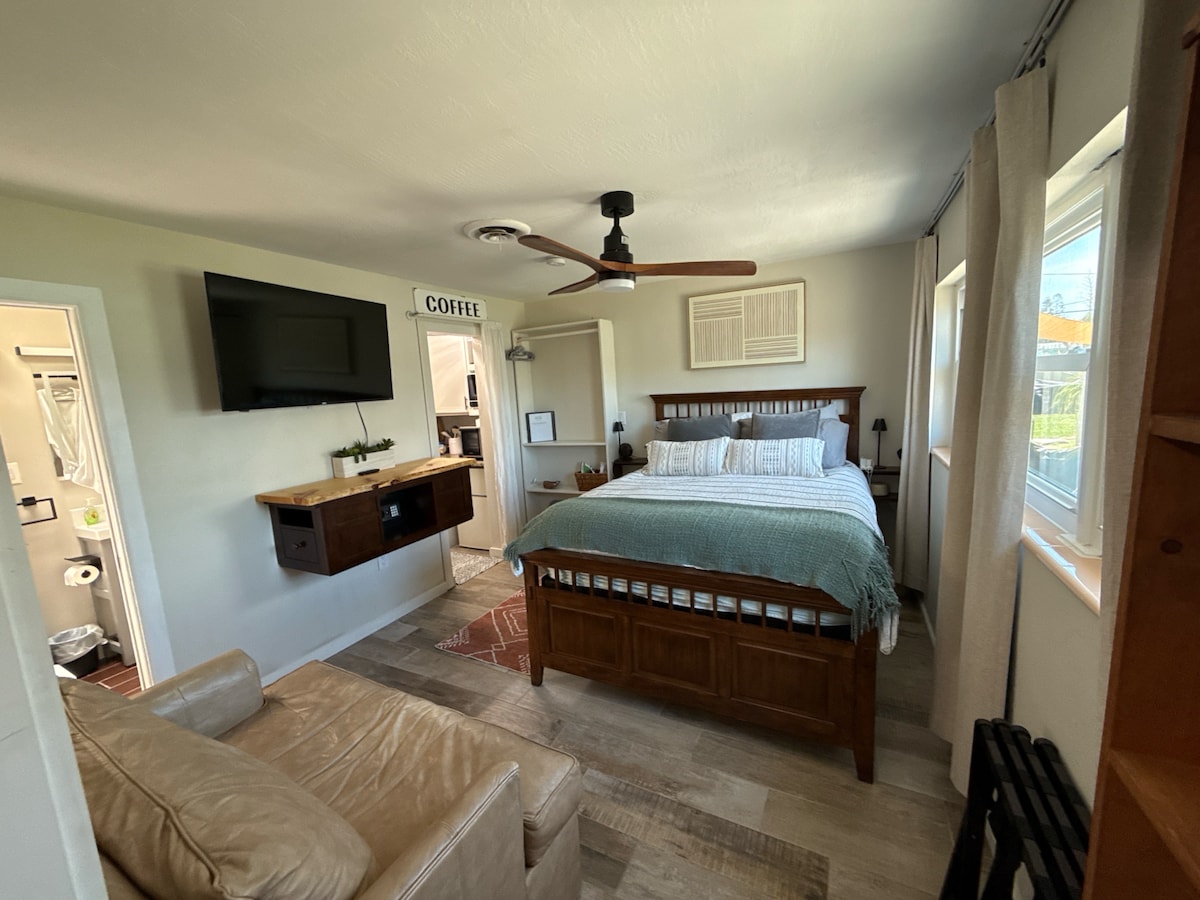 Onze gezellige suite met één slaapkamer, gelegen in het hart van Merritt Island, beschikt over een comfortabele slaapkamer, een complete badkamer en een kitchenette met een minikoelkast, een magnetron en een broodrooster, perfect voor lichte maaltijden of snacks. Deze suite ligt op slechts enkele minuten van heerlijke eetgelegenheden en levendige lokale bars en is een fantastische uitvalsbasis om alles wat Brevard te bieden heeft te verkennen. Slechts 10 minuten rijden naar Port Canaveral, het is een ideale plek voor cruisereizigers die op zoek zijn naar een pre- of post-voyage retraite!