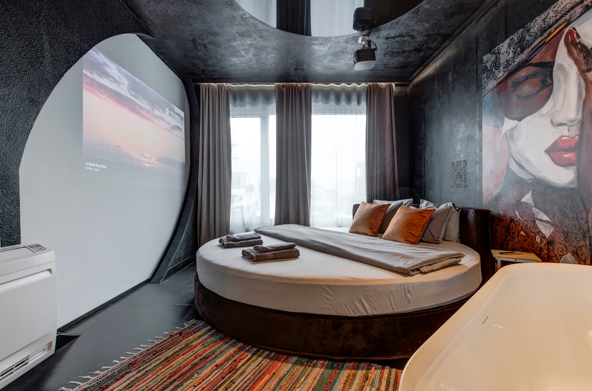 Welkom in een buitengewoon toevluchtsoord dat ongeëvenaarde stijl en luxe uitstraalt. Dit extravagante appartement beschikt over een unieke ronde slaapkamer en een geavanceerde projector, die een onvergetelijk verblijf belooft. Dompel jezelf onder in de schoonheid van de prachtige kunst die elke hoek van deze uitzonderlijke ruimte siert. Stap in de ronde slaapkamer, waar innovatief design en ultiem comfort samenkomen. De projector voegt een element van filmische magie toe, zodat je kunt genieten van je favoriete films.