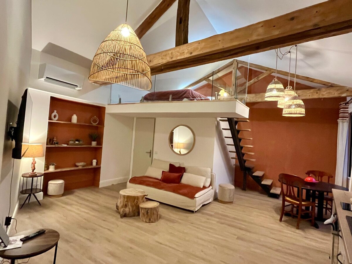 Studio onafhankelijk van ons huis. Je komt binnen via de woonkamer met erker met prachtige helderheid en uitgerust met verduisteringsgordijnen om de gewenste duisternis te bereiken. Leuk Houten terras, beschut. Uitgeruste keuken: kookplaat, afzuigkap, oven, koelkast, magnetron, koffiezetapparaat, waterkoker. Kamer tweepersoonsbed, garderobe, opbergblok. Badkamer douche, wastafel/toilet. Parkeerplaats en speciale toegang tot de poort.