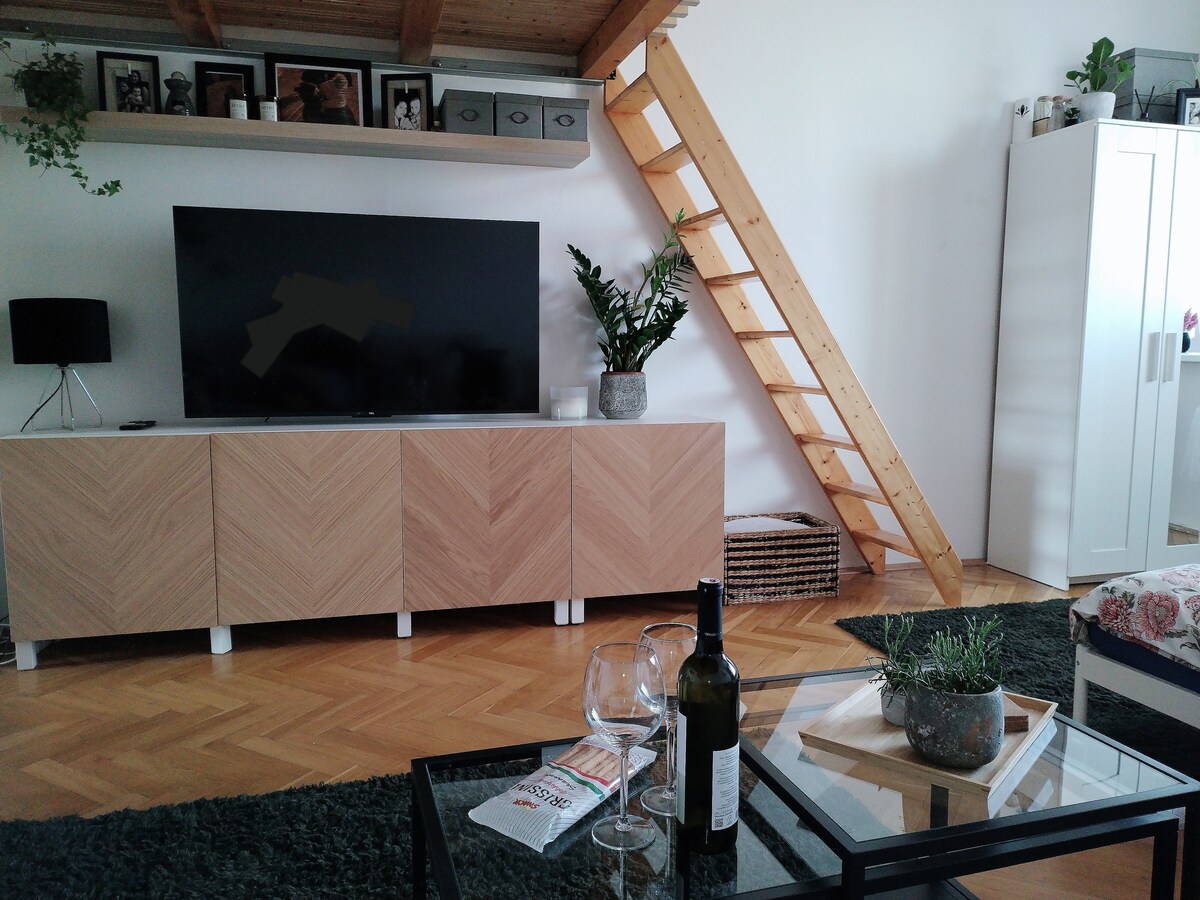 Zonder lift naar de 3e verdieping, maar dicht bij het busstation en op loopafstand van het stadscentrum. Het kleine en gezellige appartement is geschikt voor reizende gezinnen en individuen. Het heeft een badkamer met douche, een ingerichte kitchenette, een groot tweepersoonsbed, een bank, een tv, een bureau en een eettafel. De andere twee en een half bedden bevinden zich in de slaapgalerij waar ook veel speelgoed is. Het appartement is niet geschikt voor het organiseren van feesten, vrijgezellenfeesten, enz. We eisen strikt dat de nachtrust wordt gerespecteerd.