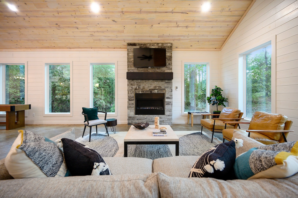 Modern Luxury Cabin | 2 King Suites • EV Charger • Pet-Friendly Discover The Modern—a stunning, design-forward cabin on 3.5 private acres in Broken Bow. Featuring soaring 18-ft ceilings, large windows, an all-white chef’s kitchen, wood stove, and 2 luxe king suites (one w/ soaker tub). Enjoy forest views, cozy up by the fire, and charge your EV onsite. Dog-friendly too! Book your unforgettable getaway today.