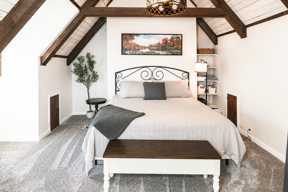 De Treetop Suite, onlangs uitgelicht in Midwest Living's 'Best Romantic Getaways in Indiana', ligt bovenop een van de hoogste heuvels in Brown County en biedt een prachtig uitzicht. Deze luchtige loft heeft een bubbelbad, een seizoensgebonden gashaard, een complete keuken en een kingsize bed - een uitnodigende plek om te ontspannen, op te laden en te 'nesten'. Kamerhoge ramen vervagen de grens tussen binnen en natuur en vullen de ruimte met licht en prachtige heuveltoppen. Een echt speciaal, gedenkwaardig toevluchtsoord.