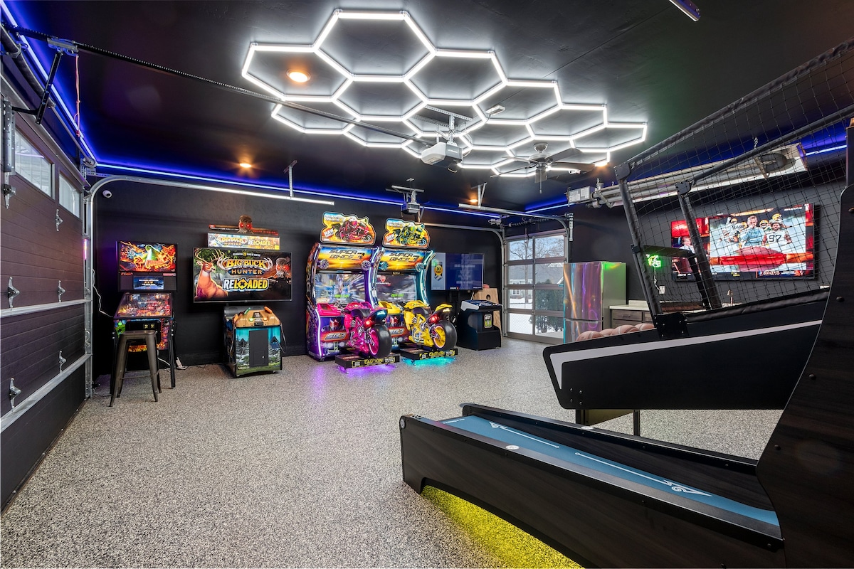 Loop naar Lambeau Field vanuit deze nieuwe woning met 6 slaapkamers! Perfect voor groepen, het beschikt over een hottub, verwarmde arcade-entertainmentgarage met de volgende spellen; Skeeball, Basketball, Buck Hunter, Godzilla Pro Pinball, ClassicCade Multicade, Golden Tee, Duck Locker Claw Machine en Super Bikes 3. Geniet van de ultieme Green Bay-ervaring met ruimte voor je hele bemanning, op slechts een steenworp afstand van het stadion, Resch Expo en populaire bars. Grote groepen slapen comfortabel in 6 kingsize bedden en een slaapbank.