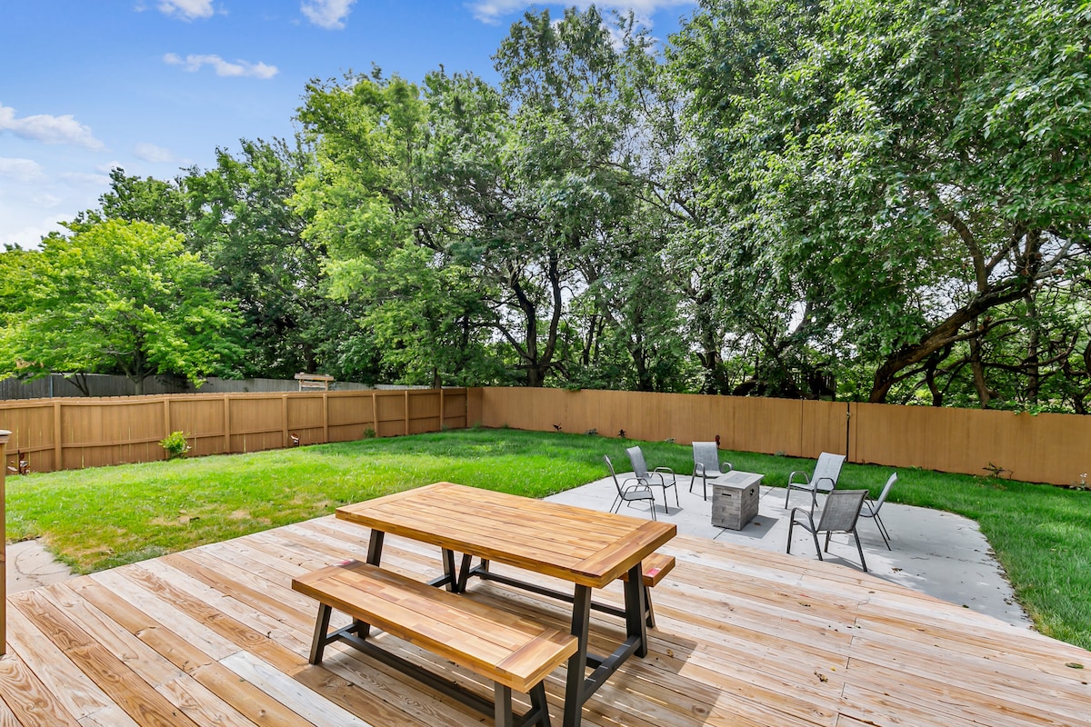Neem het hele gezin mee of geniet van de ruimte voor jezelf. Het 'Hoofdhuis' in Andover, Kansas is een gezellige, geweldige plek met veel ruimte voor iedereen. Deze woning is volledig gerenoveerd in 2024 en biedt drie slaapkamers, twee met zachte queensize bedden en een met stapelbedden (een vol en twee eenpersoonsbedden). De keuken is gevuld met tal van items om te koken tijdens je verblijf en er is een wasserette op het terrein. Aparte werkruimte met bureau en geweldige verlichting op het terrein. Geweldige, handige locatie in de buurt van de tolweg.