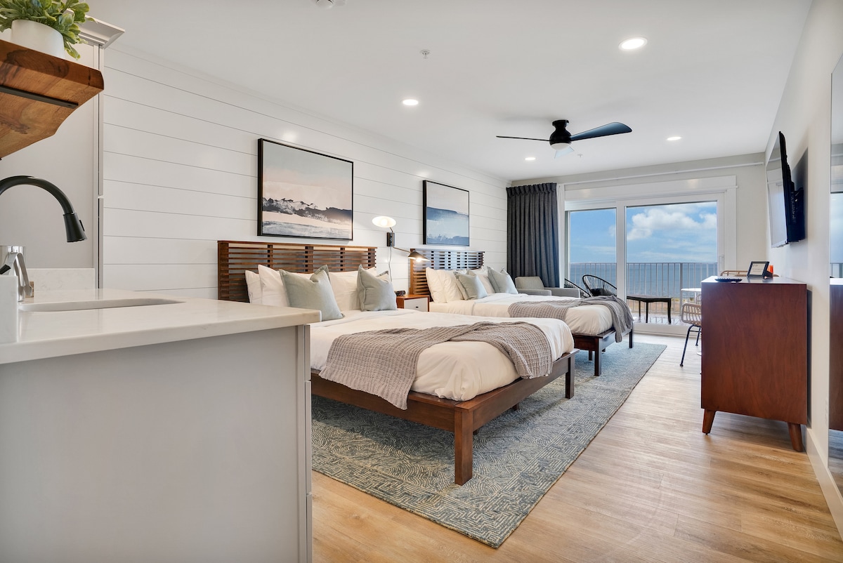 Kom een tijdje logeren in de New Kure Lighthouse Inn! Volledig gerenoveerd, met modern design uit het midden van de vorige eeuw, luxe appartementen met een adembenemend uitzicht op de oceaan! Geniet van koffie op je patio met uitzicht op het strand of geniet 's avonds van een glas wijn in onze vuurplaats. Geschikt voor maximaal vier gasten: twee queensize bedden, fris katoenen beddengoed en zachte zachte handdoeken! Kleine kitchenette met magnetron, kleine koelkast en een Keurig koffiezetapparaat. Kom tot rust op het strand!