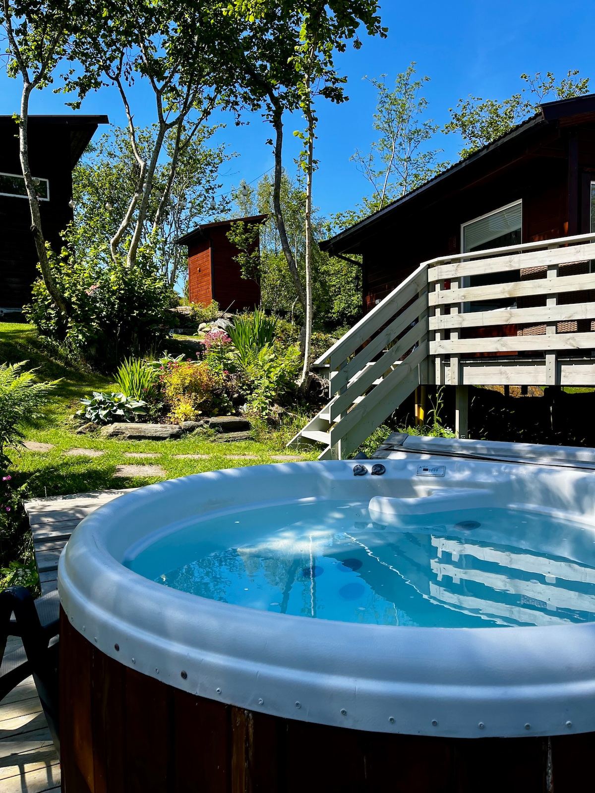 Moderne hytte med stor terrasse og idyllisk hage
