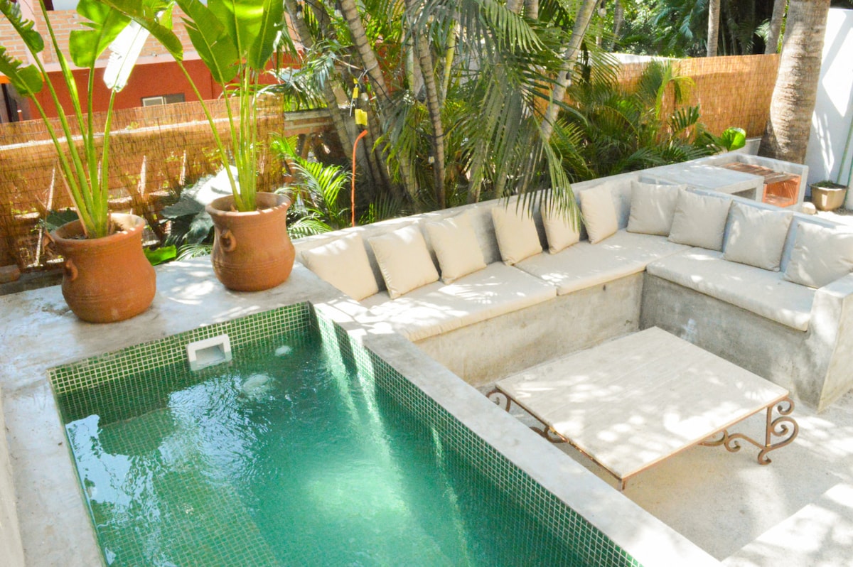 Cozy loft style apt with private outdoor palapa level complete with daybed, lounging chairs and pool access. Relax or work outside with tropical views of purple mountains and the deep blue ocean. Only 5 blocks from the ocean, 3 blocks to restaurants, cafes and stores. Equipped kitchen that includes all new appliances. All new queen mattress, bedding, towels and pillows. Washer/dryer, delivered filtered water, gated security door Pickleball courts nearby. Discounts for monthly stays.