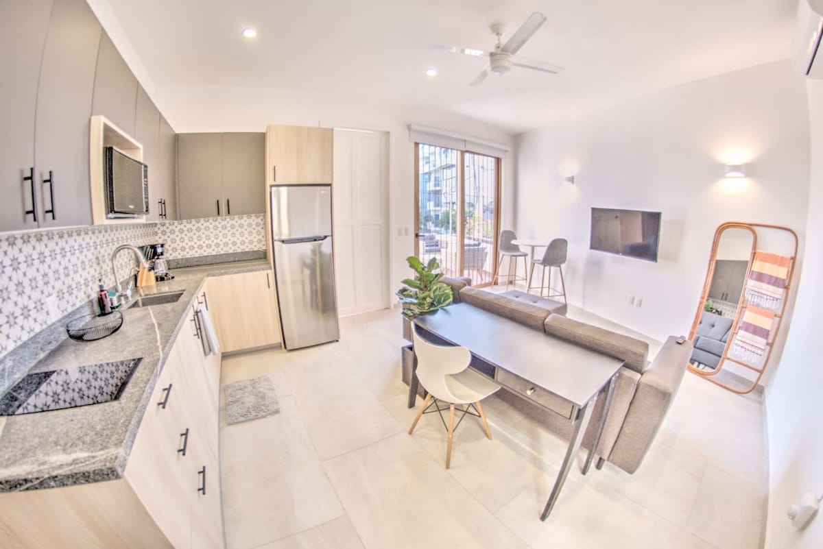 Charmant appartement op slechts 3,5 blokken van het strand, 1 van de Gouden Zone, 1 van Restaurant Row (5 de Mayo) en 6,5 van het centrum. Ontspan op je eigen terras, steek de houtskoolgrill aan of pak de meegeleverde strandspullen voor een dagje in de zon. Met snelle wifi, een speciale werkplek, airconditioning met omvormer en zonnepanelen biedt het appartement een comfortabel, milieuvriendelijk verblijf in een levendige, beloopbare buurt.