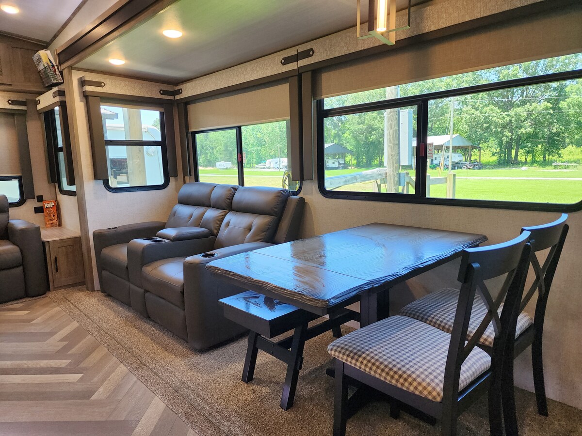 Deze gloednieuwe, prachtige camper ligt aan de rivier de Tennessee, in de jachthaven van Clifton en het Camperpark. Volledige keuken, badkamer en leefruimte met uitschuifbare bank. Geniet van je kopje koffie 's ochtends met een geweldig uitzicht op de prachtige rivier de Tennessee en ga dan naar de Clifton Marina Bar & Restaurant voor ontbijt, lunch of diner. We hebben golfclub sets die kunnen worden verhuurd voor $ 25,00 per dag. Ross Creek Golf Course ligt hier in Clifton.