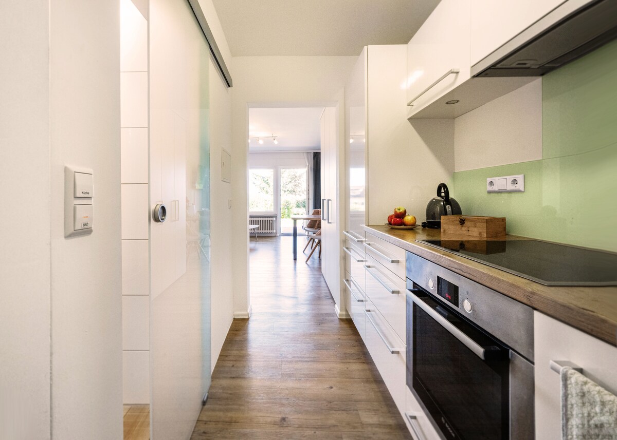 Beste vakantiegast, het appartement is 100 m ² en is uitgerust met een zeer lichte en ruime woonkamer, twee slaapkamers met tweepersoonsbedden, de grotere heeft een extra bed, een moderne keuken en een badkamer met douche en apart toilet. Woonkamers en slaapkamers evenals een hal zijn ingericht met natuurlijke houten vloeren. Het gerenoveerde appartement ligt op ongeveer 2 minuten lopen van het historische stadscentrum van Meersburg.