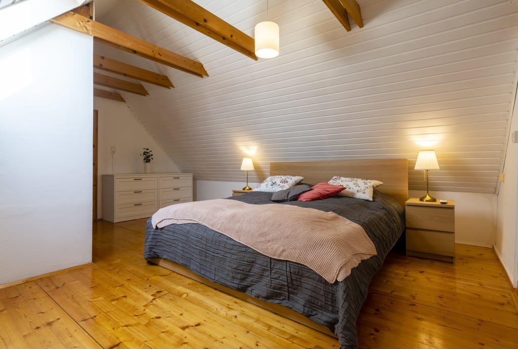 Our hayloft bears this name because the former hayloft was located exactly where the holiday flat is now. Before we bought the farm, it was an independently run farm. - 51 m² - 1st floor, courtyard side, south-facing - 1 living room with pull-out sofa bed for 2 people - Dining table with 2 chairs and bench - Fully equipped kitchen - 1 bedroom with double bed and wardrobe - Satellite TV - 1 bathroom with shower and hairdryer - 1 separate toilet