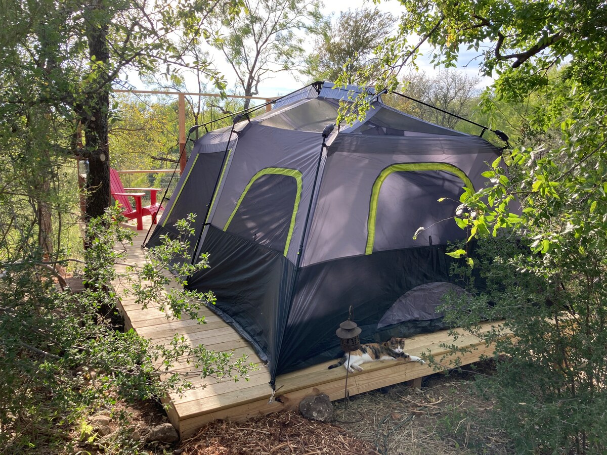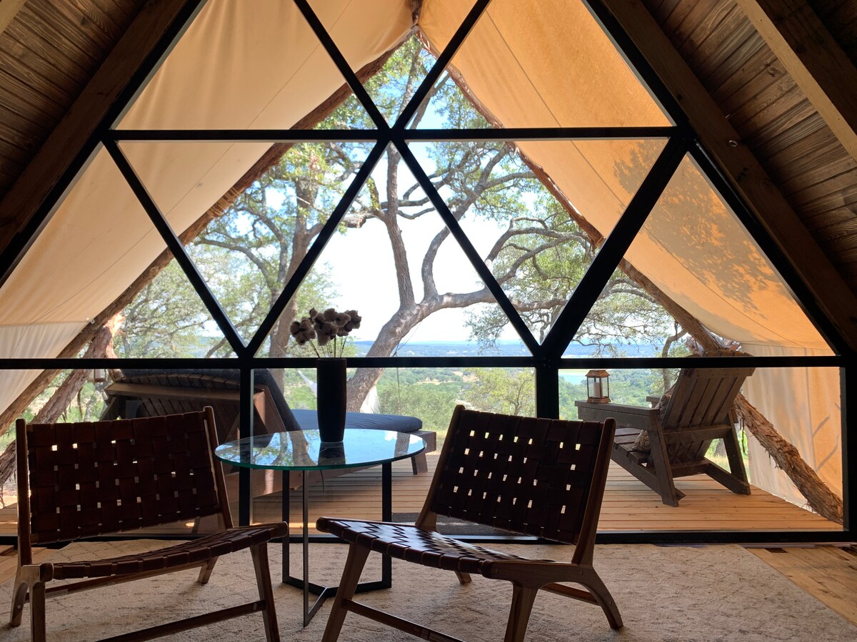 De Grand Tesoro-tent in Talula Mesa Glamping Resort (1 van de 4 tenten hier) Bubbelbad onlangs toegevoegd! Ultracomfortabele Glamping in een hybride tent/hut (met airco en warmte) = het ultieme uitje. We hebben alles geleverd wat je nodig hebt - paddleboards, kajaks, tuinspellen, een buitenfilmstation, vuurplaats, grill, koelkast, koffie, hangmatten, yogamatten en meer. Groot uitzicht op het heuvelland en Lake Travis begroeten je bij elke bocht. Toegang tot het meer van Travis - op twee minuten afstand. Flat Creek Winery - 10 minuten