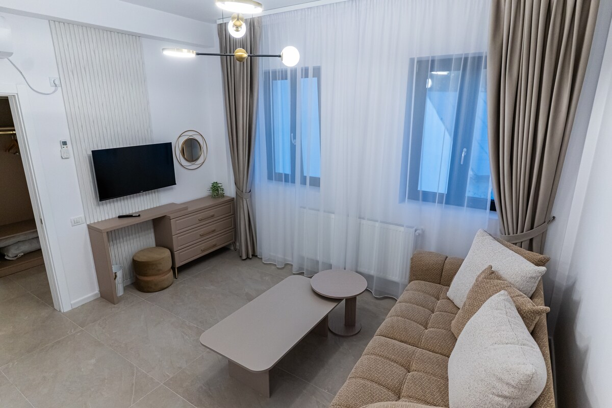 Deze kamer is ruim en comfortabel en ideaal voor koppels, gezinnen of zakenreizigers. Het beschikt over een tweepersoonsbed en een slaapbank, die extra ruimte biedt voor ontspanning of extra accommodatie. Het appartement beschikt over een eigen badkamer met een douche, gratis toiletartikelen en een haardroger. Voor extra comfort is het uitgerust met een minibar, airconditioning, een flatscreen-tv met kabelzenders, gratis WiFi en een opbergkast. Een elegante en gastvrije ruimte, perfect voor een ontspannen en zorgeloos verblijf.
