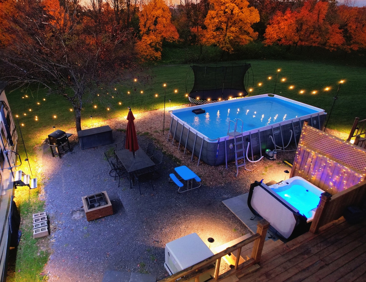 4-seizoenen North Point luxe 5th wheel camper op onze 100+ hectare beboste boerderij in de buurt van Ottawa. AI-gestuurde verwarming handhaaft ~21 °C met een evenwichtige luchtvochtigheid de hele winter Geniet van kampvuren, 24/7/365 bubbelbad, seizoensgebonden zwembad, trampoline, houtskoolbarbecue en een eigen weide- naar bospad. Geweldig voor het spotten van wilde dieren en sterrenkijken ~10 minuten naar Almonte (Mill St. boetieks, cafés, Riverwalk) ~15 minuten naar Carleton Place (Mississippi Lake, paden langs de rivier) ~30 minuten naar het centrum van Ottawa (musea, parlement, ByWard Market)