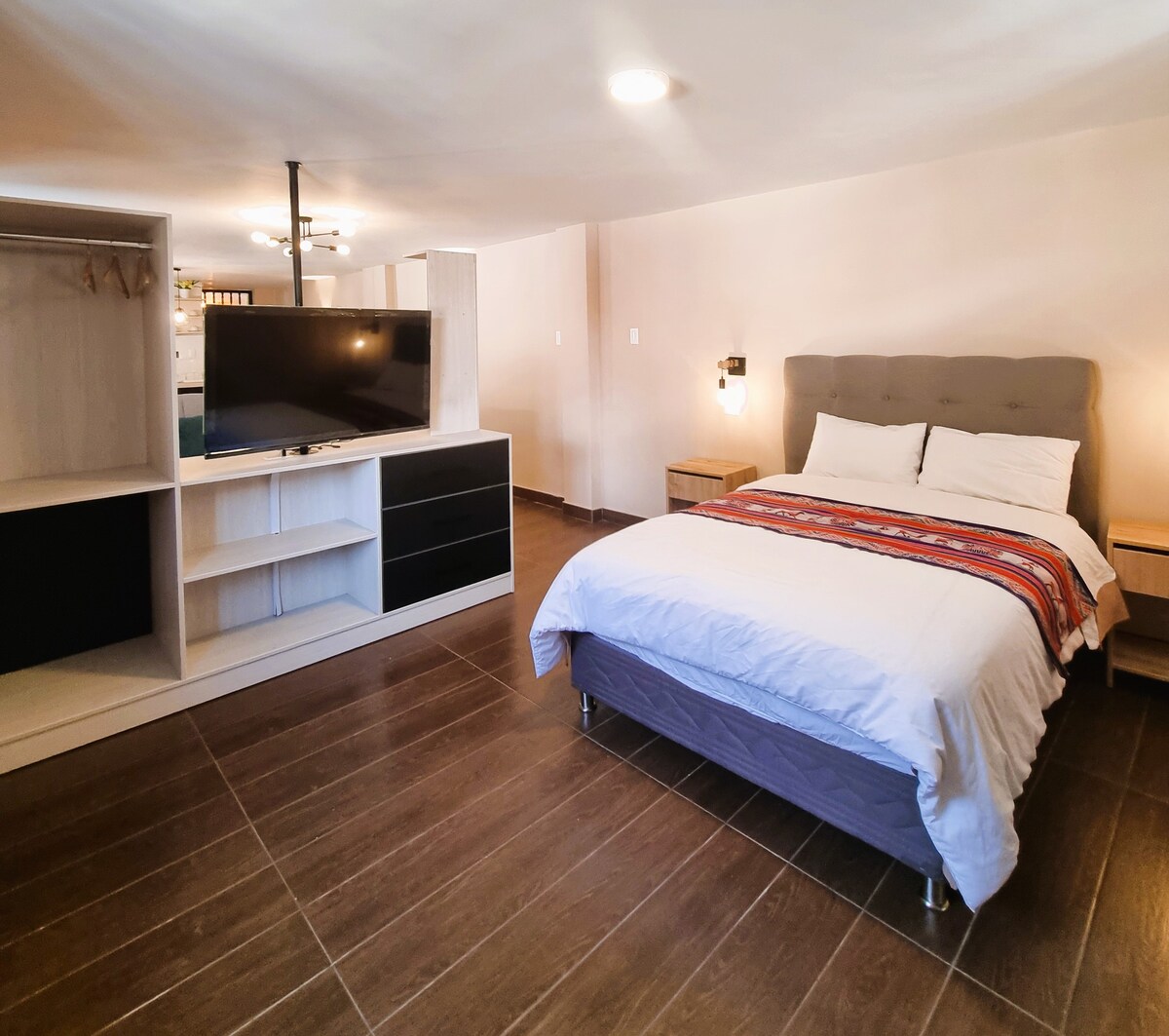 Máxima higiene en nuestro moderno departamento estudio de estreno a 5 minutos de la plaza de armas y de los Centros Comerciales. Implementado con todo lo necesario para vivir una confortable estadía en la mejor zona urbano residencial, céntrica y segura de Cajamarca. Agua caliente en todas las llaves, cocina totalmente equipada, todos los artefactos y utensilios requeridos, acceso a wifi de alta velocidad y tv de 55”.