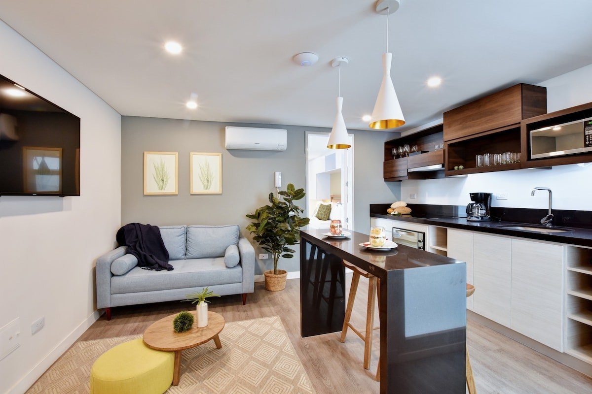 Loft-appartement op de 7e verdieping met geweldig balkon en uitzicht op de tuin. Het bestaat uit een kamer met hoogwaardig kingsize bed, badkamer en eigen dressoir, volledig uitgerust met airconditioning, 300mb wifi, kluis, smart-tv met Netflix-abonnement en verschillende tv-kanalen. Kook met zijn apparatuur. Het Hayedo de Juanambu-gebouw heeft een receptie met 24/7 privébeveiliging, liften, overdekte parkeergelegenheid, mooie fitnessruimte in de sociale ruimte, Turks, coworking, zwembad op de 9e verdieping.