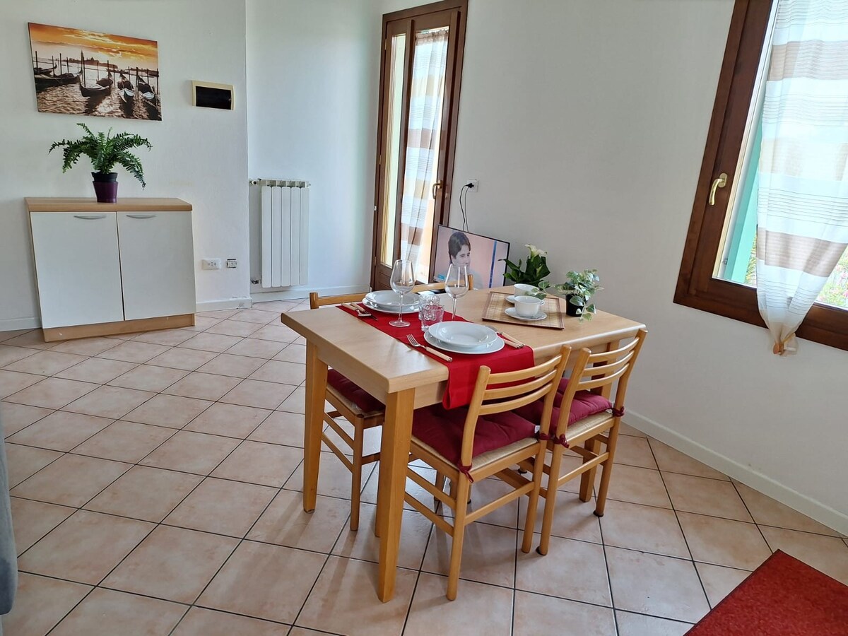 Grazioso appartamento all'interno di un piccolo contesto di 4 unità, posto al piano primo con ingresso indipendente, proprio al centro del piccolo paese di Scaltenigo, a pochi passi da un' antica chiesa cattolica, comodo a tutti i servizi, supermercato, fruttivendolo, banca, farmacia, gastronomia , pizzeria da asporto , panificio, bar, negozio di abbigliamento. La stazione dei treni è a 4 minuti di auto ( Dolo) o a 5 minuti ( Mira-Mirano) e in 20/25 minuti siete a Venezia o Padova.