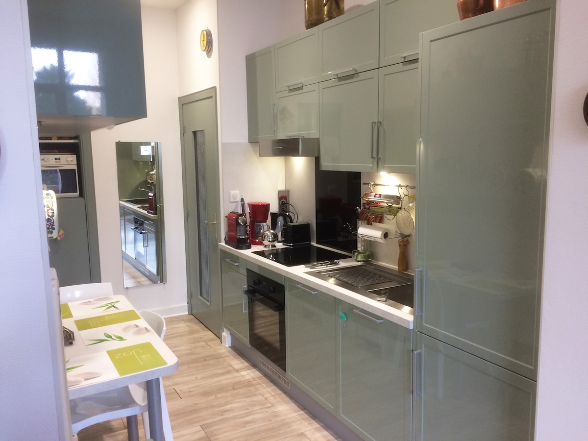 Ontspan in dit rustige en stijlvolle gelijkvloerse appartement in de buurt van de zee. Om je het beste te verwelkomen, bestaat dit appartement uit: Een keuken met oven, magnetron, vaatwasser, koelkast met kleine vriezer, inductiekookplaat, broodrooster, waterkoker, Mr. Croque-apparaat, traditioneel koffiezetapparaat. 📺 TV-slaapkamer: bed 140 x 190 (beddengoed aanwezig) Slaapbank in de woonkamer: 140 x 190 (beddengoed aanwezig) Kinderen: opklapbaar BBQ-bed + matras + BB-stoel