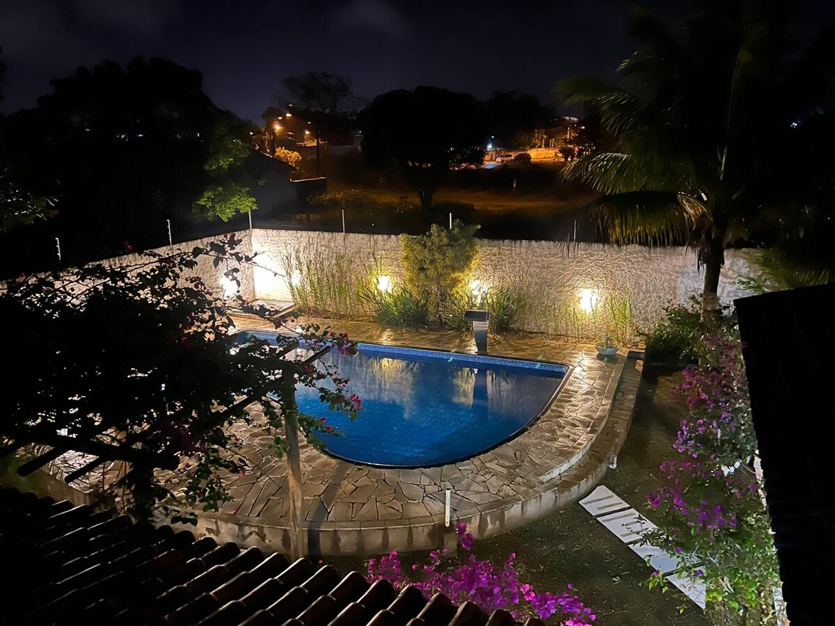 Huis in rustieke stijl, ideaal voor het hele gezin, inclusief kinderen en huisdieren. Of om die vriendengroep op een onvergetelijke reis te ontvangen! Luchtig en goed verlicht huis, hoog plafond, 3 slaapkamers met krachtige plafondventilatoren, één suite met airconditioning. Thuiskantoor, wifi, tv met Netflix, Disney en Spotify. Overdekte garage voor 2 auto 's. Draagbare barbecue. Kinderkamer met speelgoed en spelletjes. Beboste achtertuin. Balkon met hangmat en fauteuils.