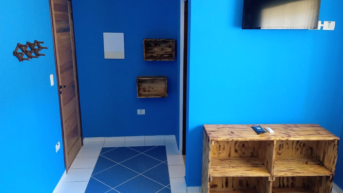 Um quarto especial com uma cama de casal, decorado com a arte da Aly, mesinha, banheiro, roupa de cama e banho, TV, ventilador de teto e guarda roupa. Aqui é a CasAtelier da artista humanista Aly da Costa!!! É um espaço dedicado ao descanso e ao lazer das pessoas que valorizam a simplicidade, sem abrir mão do conforto e o contato direto com a natureza. Chamamos de o "Pedacinho do Paraíso", um local de vivenciar a harmonia entre o ambiente e o ser. Venha compartilhar conosco essa experiência.