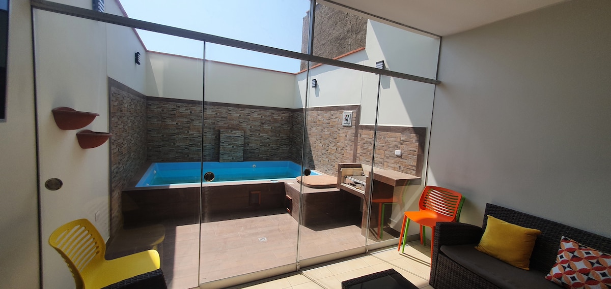 Ontspan met een spectaculair uitzicht op de oceaan, het zwembad, beveiligde parkeergelegenheid in het condo. Toegang tot de zee, vlakbij de beste golven in het zuiden zoals Peñascal, Huayco, Santa Rosa, Los Muelles de San Bartolo. Volledige keuken, magnetron, koelkast, koffiezetapparaat, waterkoker, warm water, wifi, een comfortabele futon of slaapbank, een opblaasbaar matras en verrekijker voor landschappen. LEES HUISREGELS.